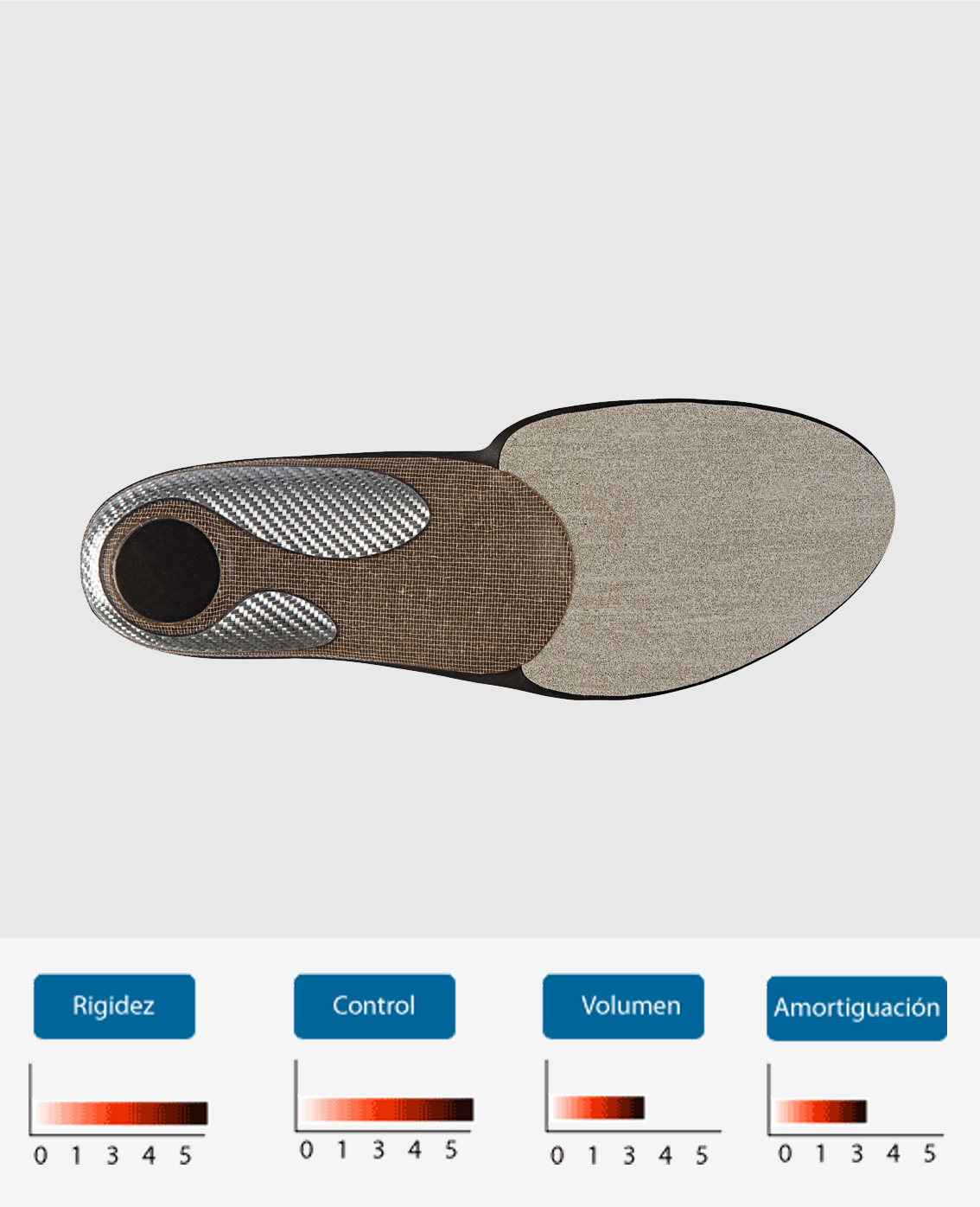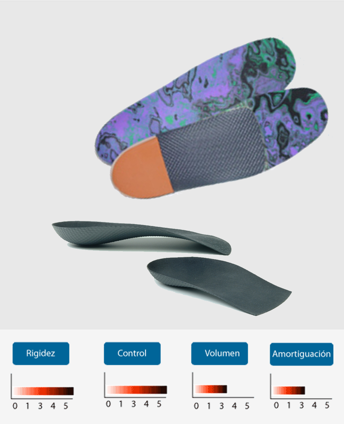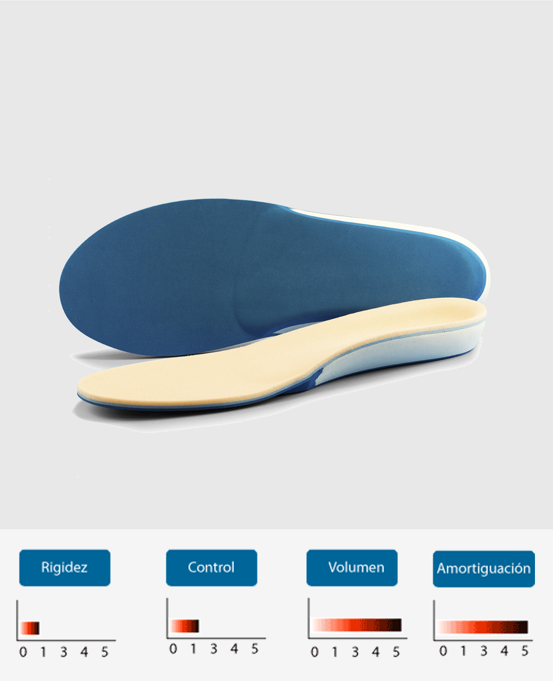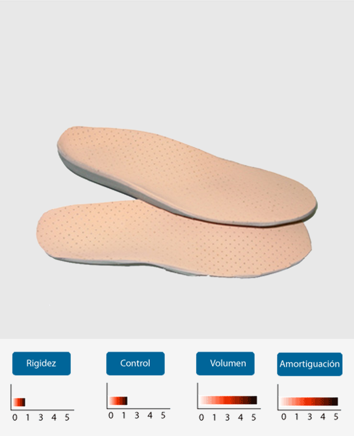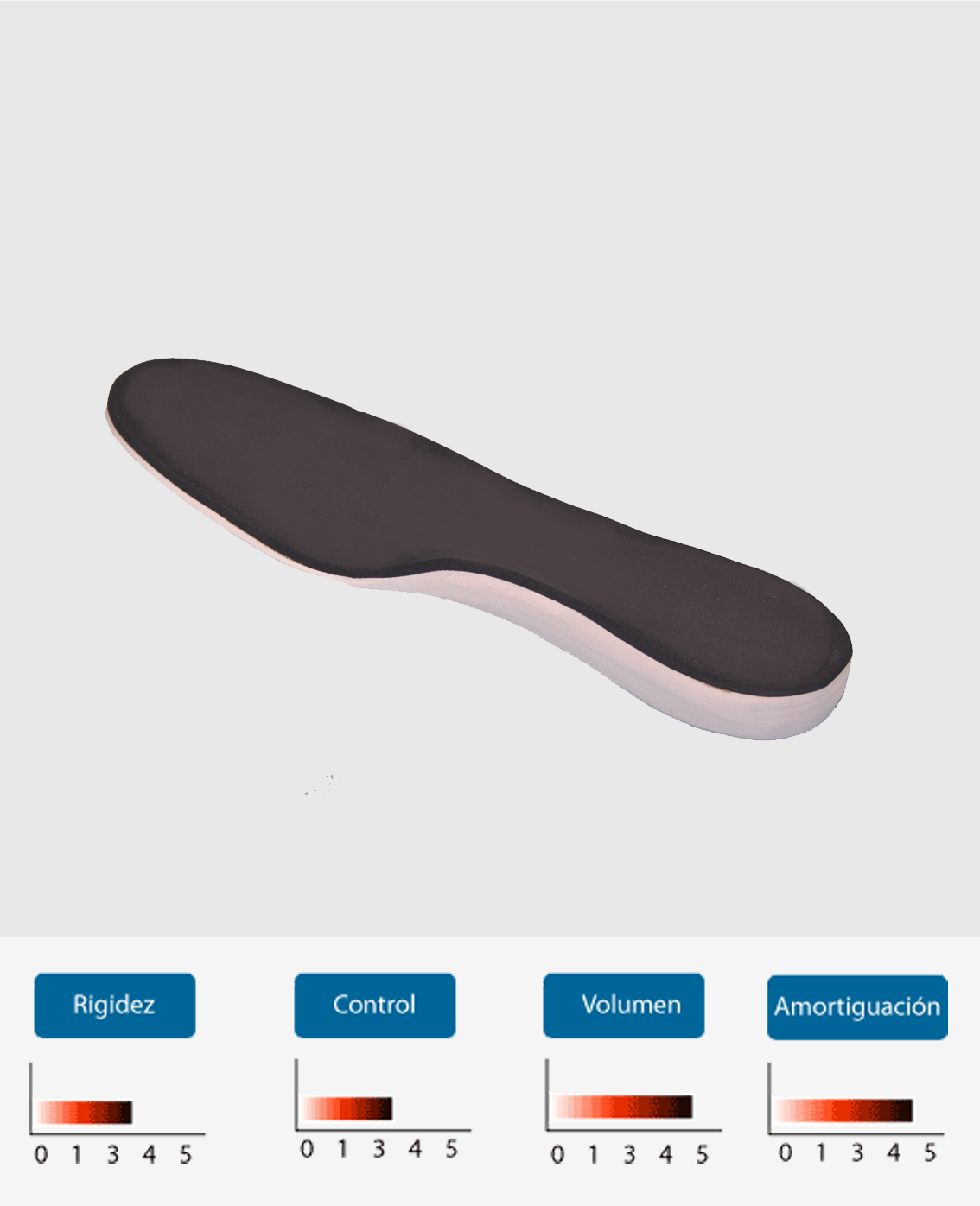 Escuma d'EVA amb una densitat de semi blanda. La base manté la correcció necessària en pacients de fins a 80 kg, però sense limitar els moviments del peu.